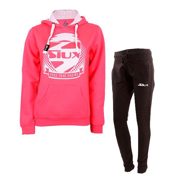 Equipación Siux mujer sudadera fucsia y pantalones negros, una combinación perfecta para jugar al pádel. Alta calidad con el mejor diseño Siux.