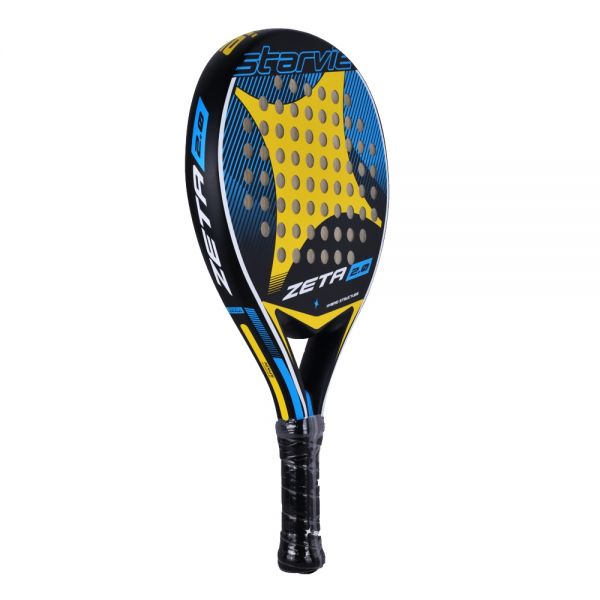 La pala StarVie Zeta 2019 de diseño llamativo en color azul con amarillo. Está diseñada en forma redonda y cuenta con un balance medio ideal para ofrecer un máximo control en el golpeo. Además incorpora materiales de carbono para un extra de potencia y solidez en los golpeos.