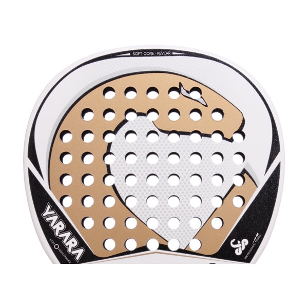 La Vibor-a Yarara 2015 es una pala que combina el fondo de cara de la pala con un blanco característico de la marca y un color dorado para el diseño de la marca, así como el perímetro del marco con una línea negra. Cuenta con una cuerda de agarre bordada, tapón y goma personalizada.