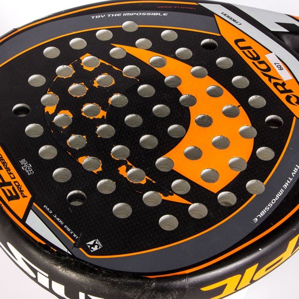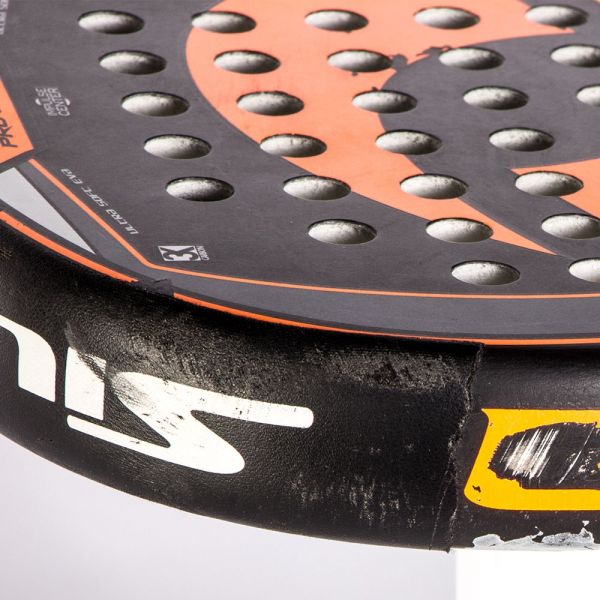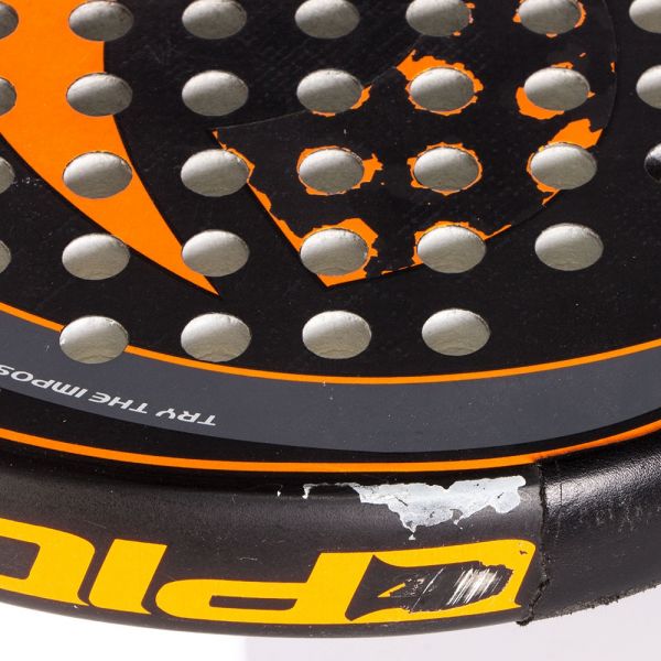 La Orygen Epic Naranja es una pala polivalente que consigue un gran comportamiento en diferentes puntos de control y potencia. Esta pala es de segunda mano, podemos apreciar el desgaste estético en la zona de las caras, por el desgaste de la pintura , los arañazos y pequeños desconchados. En una de las cara se ha borrado una parte del logo de la marca. También tiene varios roces y desconchados en el marco. Este deterioro del diseño no afecta a las prestaciones de la pala.