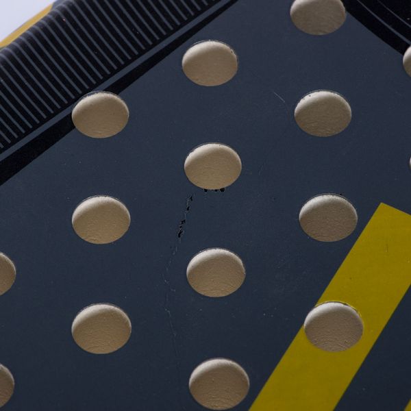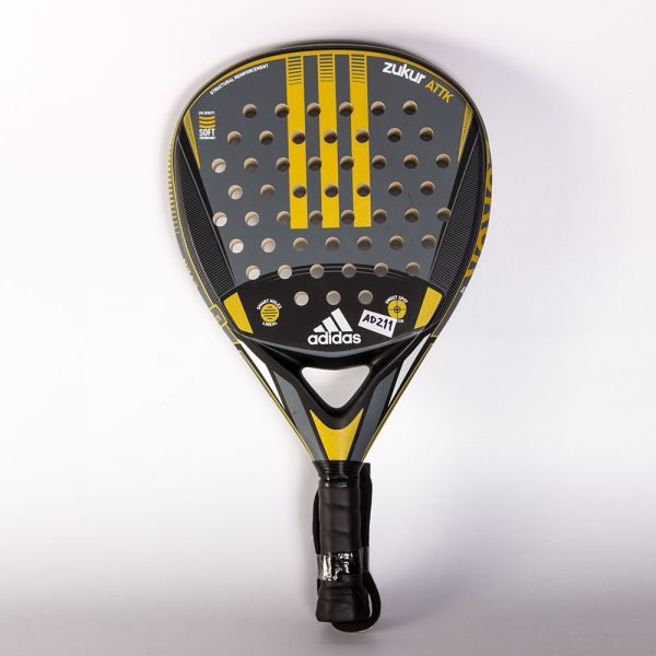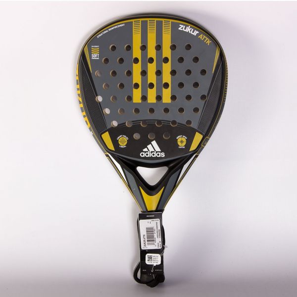 La Adidas Zukur Attk es una pala diseñada en forma de diamante con un balance alto y llamativo diseño. Confeccionada con materiales de alta calidad. Fibra de carbono en las caras y el marco de la pala, proporcionando una extructura firme y rígida. Esta pala de exposicón en muy buen estado, cuenta ocn la etiqueta original. Tiene un pequeño arañazo con salto de pintura en una de las caras. Esta imperfección estética no afecta al juego.