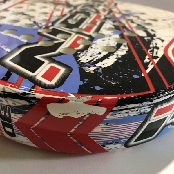 Esta pala es de exposición, por lo que no ha sido usada. Tiene un desconchado en una de las caras y un leve arañazo en el marco, cerca del puente. Este tipo de imperfecciones esteticas