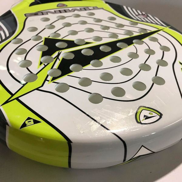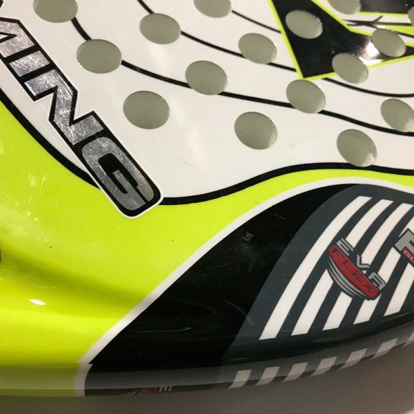 La Timing Aria es una pala de control, diseñada en forma redonda con un amplio punto dulce y balance bajo. Cómoda, ofrece un sencillo manejo. Confeccionada con las caras de fibra de vidrio y el marco de carbono. Esta pala es de exposición, por lo que no ha sido usada. Posee algún leve arañazo en las caras y restos de pegamento en la parte superior de una de las caras. Minimas imperfecciones estéticas que no influyen a las prestaciones.