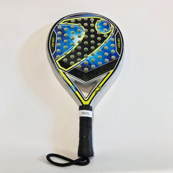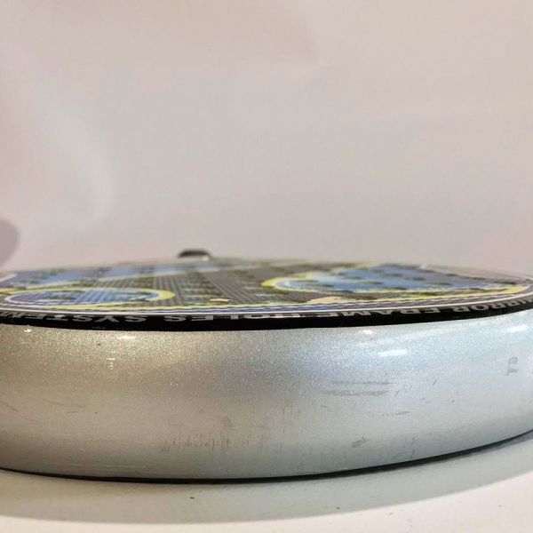 La Dabber Tuga es una pala de control , creada con un molde redondo y amplio punto dulce. Diseño llamativo con aires rebeldes en color azul, amarillo y plata. Esta pala de segunda meno se encuentra en muy buen estado, posee pequeños roces y arañazos en las caras y el marco de la pala. Este desgaste del uso no afecta al rendimiento y prestaciones de la pala.