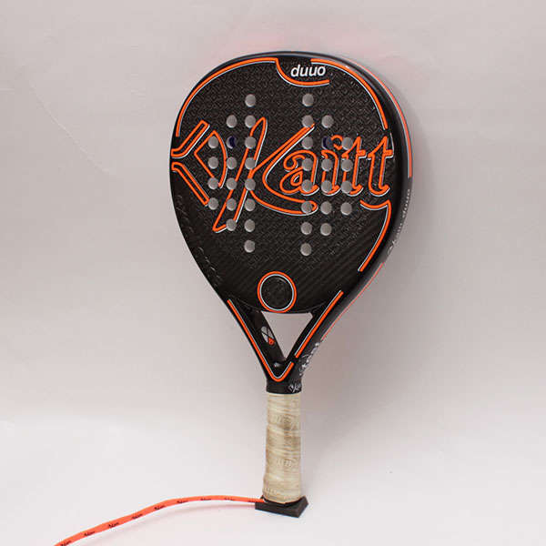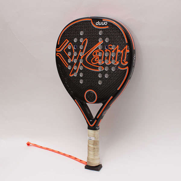 La pala Kaitt Duuo S naranja es idónea para los jugadores de padel de nivel intermedio que buscan progresar en el juego. Esta pala de segunda mano presenta algunos desconchados pequeños en la cara y el mango está ennegracido.